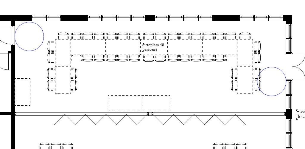 Plantegning av ene delen av selskapslokalet – med bordsetting